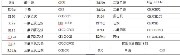 5)環(huán)燒怪、鏈烯短及其鹵代物其簡(jiǎn)寫(xiě)符號(hào)規(guī)定:環(huán)燒娃及環(huán)皖煌的鹵代物用字母“RC”開(kāi)頭,鏈烯煌及鏈烯煌的鹵代物用字母“Rl”開(kāi)頭,其后的數(shù)字排寫(xiě)規(guī)則與氟利昂及燒;怪類(lèi)符號(hào)表示中的數(shù)字編寫(xiě)規(guī)則相同。